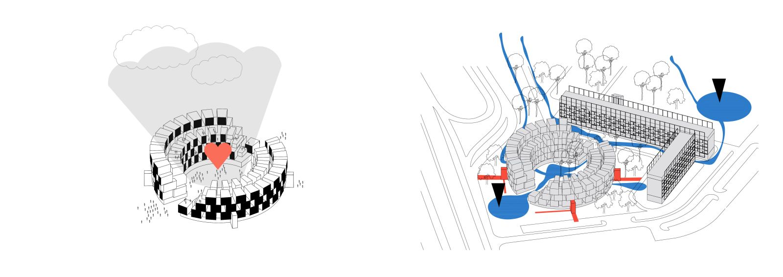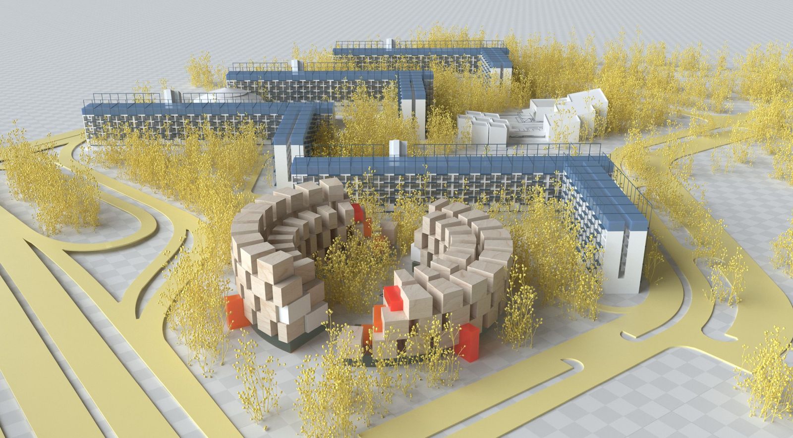 U širem okruženju, projekat teži da značajno i prepoznatlivo nadgradi vec izuzetno jak duh mesta u okviru Studentskog grada od kojeg je pre više od 70 godina krenula izradnja novog grada sa druge strane reke. Formiranjem nove zgrade, istovremeno se formira i novo mesto okupljanja - nova kapija Studentskog grada. Novi veliki “amfiteatar” pod otvorenim nebom simbolički ujedinjuje svih 1000 novih studenata, ali i sve stare koji ovuda ulaze u grad. Kružni karakter zgrade prizilazi iz potrebe za udruživanjem, formiranjem zajednica, fokusiranjem ka zajedničkom cilju i nadovezuje se na prepoznatljivu novobeogradsku urbanističku matricu, kao zaveštanje koje ovo mesto nosi sa sobom za sve buduće generacije i izgradnje.