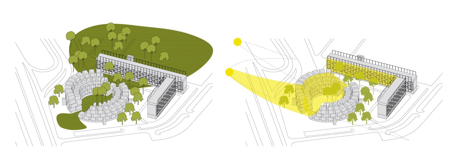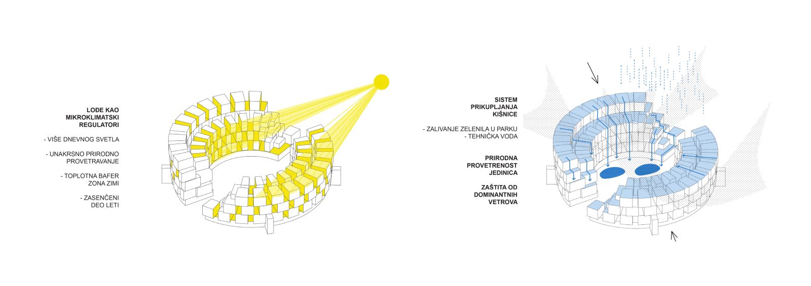 U energetskom smislu, kružni objekat pruža mogućnosti najefikasnijeg iskorišćenja najmanje fasadne površine, te time minimalizuje toplotne gubitke i dobitke tokom godine. Sve sobe su međusobno ušuškane u gusto pakovanu kružnu matricu, dok istovremeno usled radijalne dispozicije, svaka soba ima za nijansu drugačiji pogled i dnevno osunčanje. Dve polukružne lamele se razmiču tačno po osi sever-jug. Time se sa južne strane propušta maksimalno direktne sunčeve svetlosti, dok se sa severne strane uvlači šuma Studentskog grada u samo srce zgrade. Istovremeno, razmicanjem ka severu, izbegavaju se jedinice koje neće tokom dana biti direktno osunčane, i zadržava se prolaz sunčeve svetlosti direktno do postojeće Lamele 4F u neposrednoj blizini nove zgrade. Kako bi se postigao čovekomerni utisak zgrade izrazite gustine stanovanja i značajne ukupne površine, svaku lamelu čine tri nivoa (po dva sprata) koji se međusobno smiču, i minimalno kaskadiraju po visini, tako da se cela zgrada suptilno otvara ka nebu u unutrašnjem dvorištu, dok sa spoljne strane formira blagi zaklon pešaka u zoni prizemlja. Na krajnjem južnom delu parcele, ispred nove zgrade i neposredno uz autobusku stanicu na auto putu, odakle studenti svakodnevno dolaze iz centra grada, formira se novi ulaz u ceo kompleks kroz srce novog objekta, kao pandan čuvenom kružnom platou sa druge strane - prečnik unutrašnjeg dvorišta nove zgrade je 50 metara, isto kao i prečnik postojećeg ulaznog platoa kompleksa.
