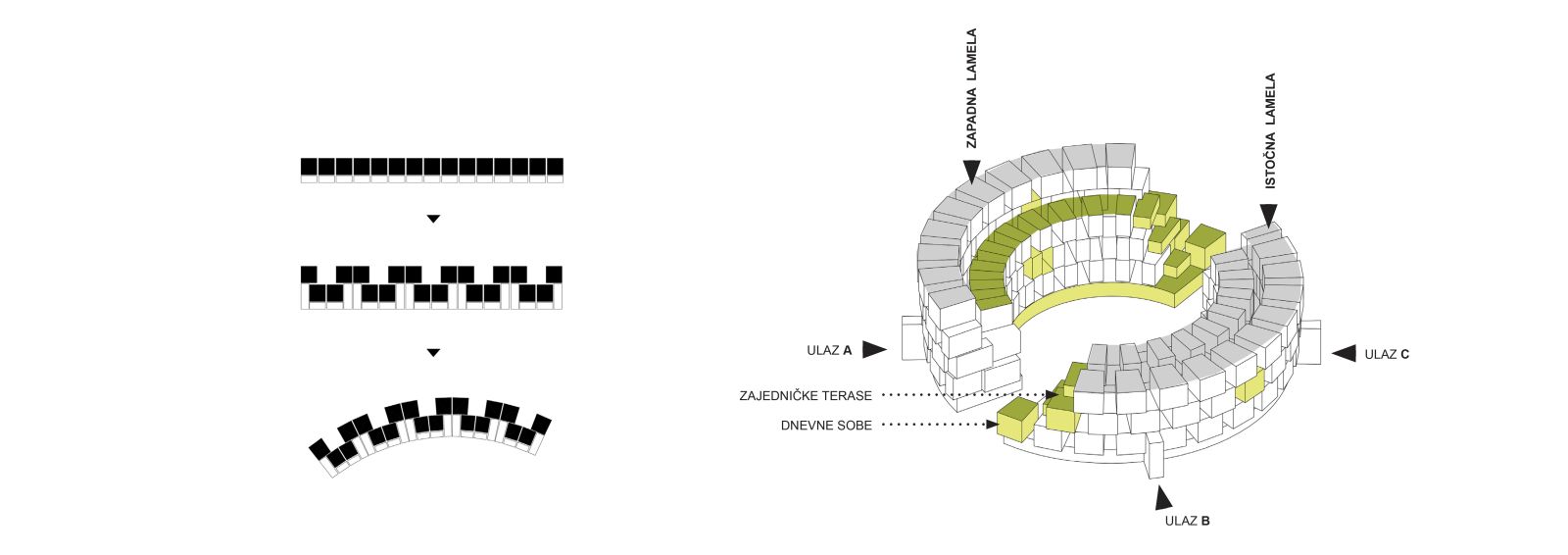 Skok od razmere jedne minimalne jedinice do razmere zgrade u kojoj je smešteno čak 1000 ljudi savladan je gustim pakovanjem i smicanjem soba po dubini, tako da se formiraju dvovisinske lođe u vidu mikro komšiluka koje dele 8 studenata. Na taj način za istu dužinu fasade umesto tri, dobijene su četiri sobe, i mali čovekomerni otvoreni prostor koji zimi ujedno može da postane i zajednička zimska bašta kada se zatvori ka spoljašnjosti. Kaskadiranjem krajeva kružnih lamela formirane su zajedničke krovne terase i velike dnevne sobe duplih visina za studente na svakom spratu. Najveća dnevna soba je na najnižem nivou iznad prizemlja, namenjena većim okupljanjima (žurke, radionice, skupovi..), dok se ka višim etažama prostori smanjuju i postaju intimniji i prigodniji za učenje i mirniji boravak. Zapadna lamela je za dve etaže viša od istočne, kako sa te strane nema bliskih suseda, pa se na njenoj krovnoj terasi nalazi veliki zajednički otvoreni prostor celom dužinom, sa pogledom na prostrano ozelenjeno unutrašnje dvorište. Vizuelnim i fizičkim povezivanjem krovnih terasa na kaskadama, inicira se povezivanje i interakcija većih grupa studenata, razmena ideja, sklapanje poznanstava… Objekat je funkcionalno podeljen na dve zasebne lamele – istočnu i zapadnu, koje mogu samostalno da funkcionišu, sa po dva ulaza – A, B, C i D. U visokom prizemlju obe lamele smeštene su veće zajedničke zone za učenje, rad i rekreaciju, uprava doma i manji kafe, dok su u suterenskoj etaži planirani svi tehnički i servisni prostori. Čitavo prizemlje je planirano kao potpuno protočno, u duhu Nove kapije Studentskog grada, tako da omogući prolaske korisnika dominantno od novog ulaza u kompleks na jugu, ali i sa tri ostale strane ka okruženju. Ukoliko to u budućnosti bude bilo potrebno i izvodljivo, u ostatku suterenskog nivoa ispod cele zgrade moguće je izgraditi podzemnu garažu sa 110 parking mesta za potrebe korisnika celog kompleksa Studentskog grada.