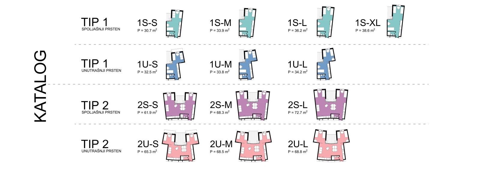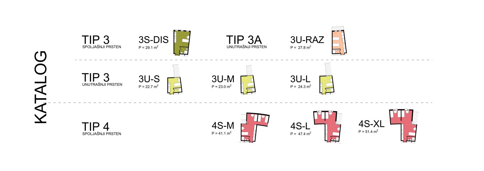 Čitav sklop grade četiri tipa jedinice, koji zatim dodatno variraju u odnosu na to da li se nalaze u unutrašnjem ili spoljašnjem prstenu lamele, i na kojem su nivou, kako se unutrašnji prsten ka gornjim spratovima sužava, a spoljašnji prsten se povećava. Primarni tip od kojeg nastaju svi ostali tipovi je Tip 1 – dvokrevetna soba sa zajedničkom lođom. U osnovnoj konfiguraciji ova soba može da smesti dva studenta, kada površinski poraste postaje trokrevetna, a ukoliko se udvoji postaje veći prostor za četiri studenta koji dele zajedničku kuhinju i kupatilo. Cela zgrada je modularno projektovana, u konstruktivnom sklopu koji može da omogući lako spajanje i razdvajanje jedinica u celom Domu na godišnjem ili višegodišnjem nivou, u odnosu na to kako se potražnja i želje za načinima stanovanja menjaju. Osnovne dvokrevetne jedinice po potrebi mogu da smeste i trećeg studenta bez narušavanja komfora, što bi značilo da kapacitet cele zgrade može da poraste za oko 50% u budućnosti.