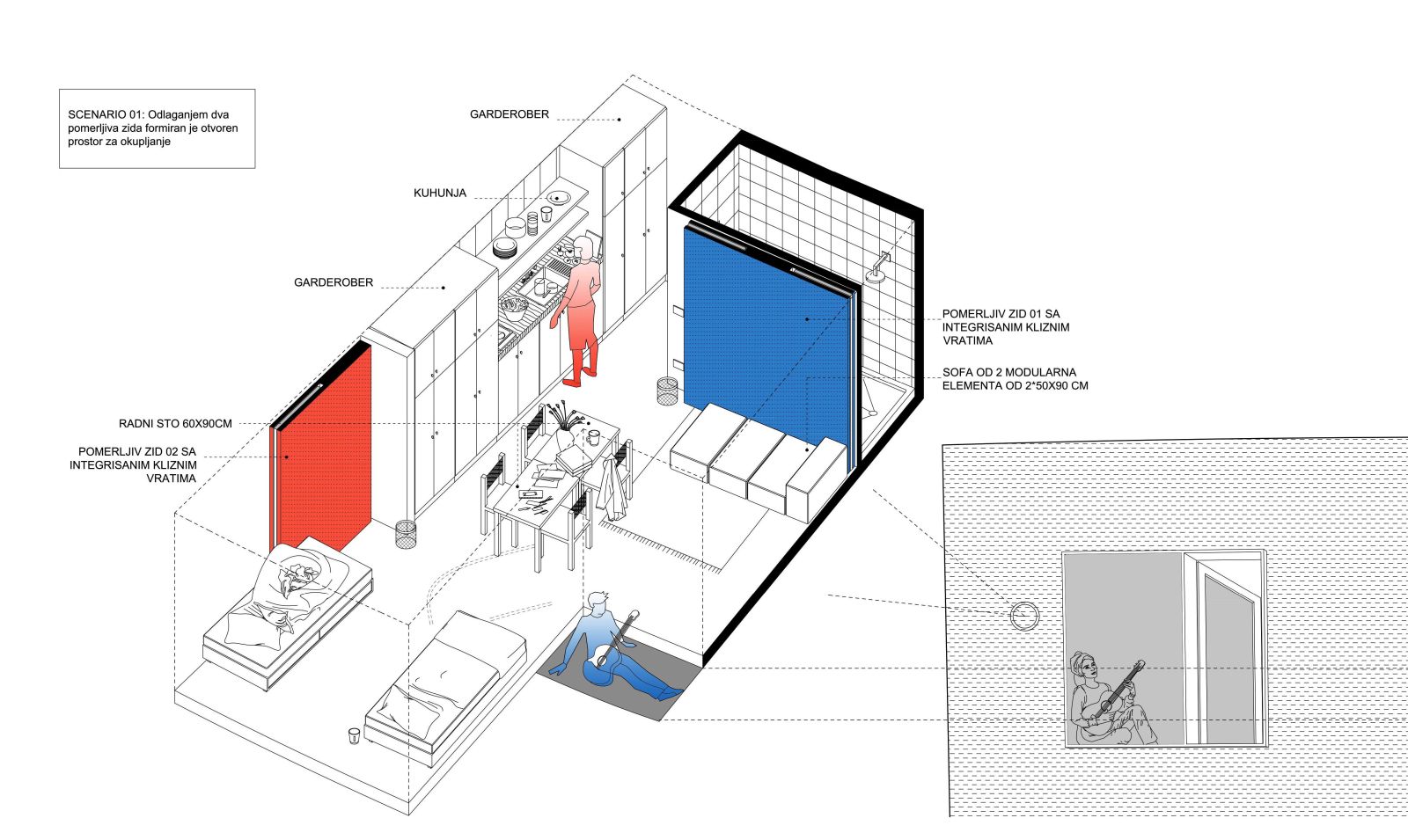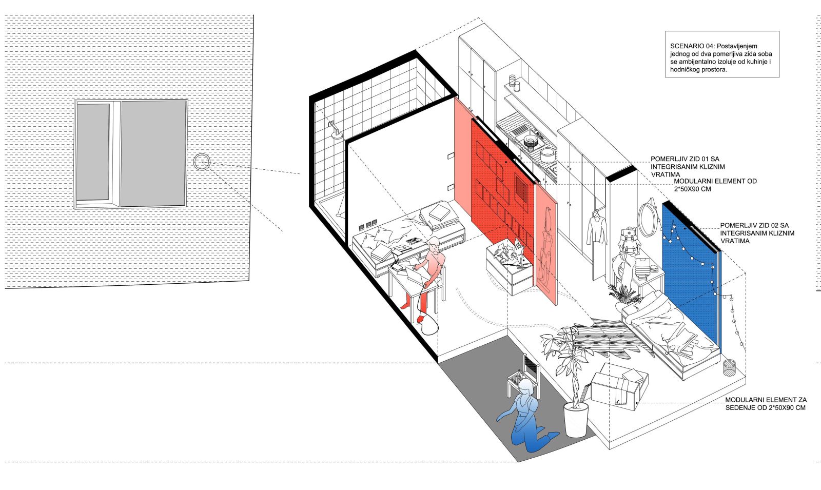 U jednom od mogućih scenarija, na samom početku boravka cimeri se ne poznaju, pa se mogu zidovima potpuno odvojiti i funkcionisati u dve zasebne sobe sa deljenim kupatilom i kuhinjom. Kako vreme prolazi i njihova bliskost raste, jedan zid mogu skloniti tako da imaju veću dnevnu zonu sa kuhinjom u kojoj bi spavao jedan student, a jednu izdvojenu sobu u kojoj bi spavao drugi. U slučaju da se još više zbliže, mogli bi odlučiti da u izdvojenom delu oboje spavaju, kako bi im dnevna zona ostala slobodna za zajedničke svakodnevne aktivnosti i okupljanja. U krajnjoj varijanti, oba zida se mogu potpuno sklopiti tako da soba postane jedan čist prostor sa maksimalno vazduha i dnevne svetlosti, pa i sa maksimalnom slobodom dnevnog korišćenja. U nekim drugim situacijama posebna konfiguracija sobe se može odmah na početku prilagoditi specifičnim potrebama stanara – ukoliko su u pitanju rođaci možda će odmah odlučiti da spavaju u izdvojenoj sobi, ukoliko je mladi bračni par takođe, dok na primer pandemijski uslovi omogućavaju potpuno izdavajanje jednog studenta od drugog.