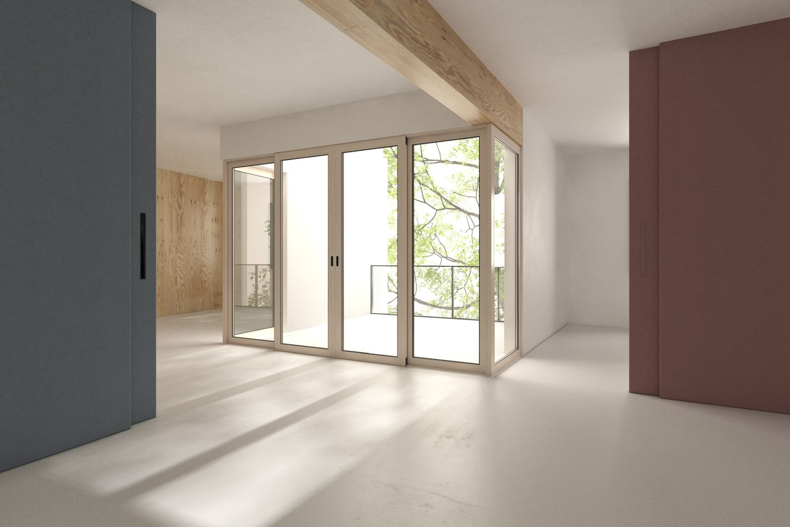 1. UNAPREĐENJE SOBA pozicioniranjem novog prefabrikovanog servisnog bloka (kupatilo i kuhinja) neposredno uz zajednički centralni hodnik u dubini sobe, tako da se omogući maksimalna širina fasade za upliv svetlosti u dnevne prostore. Rekonstrukcijom kompleksa devedestih godina prošlog veka kupatilo je iz nepoznatih razloga pozicionirano uz samu fasadu, tako da je u odnosu na originalni projekat značajno umanjen prostorni kvalitet svake stambene jedinice.