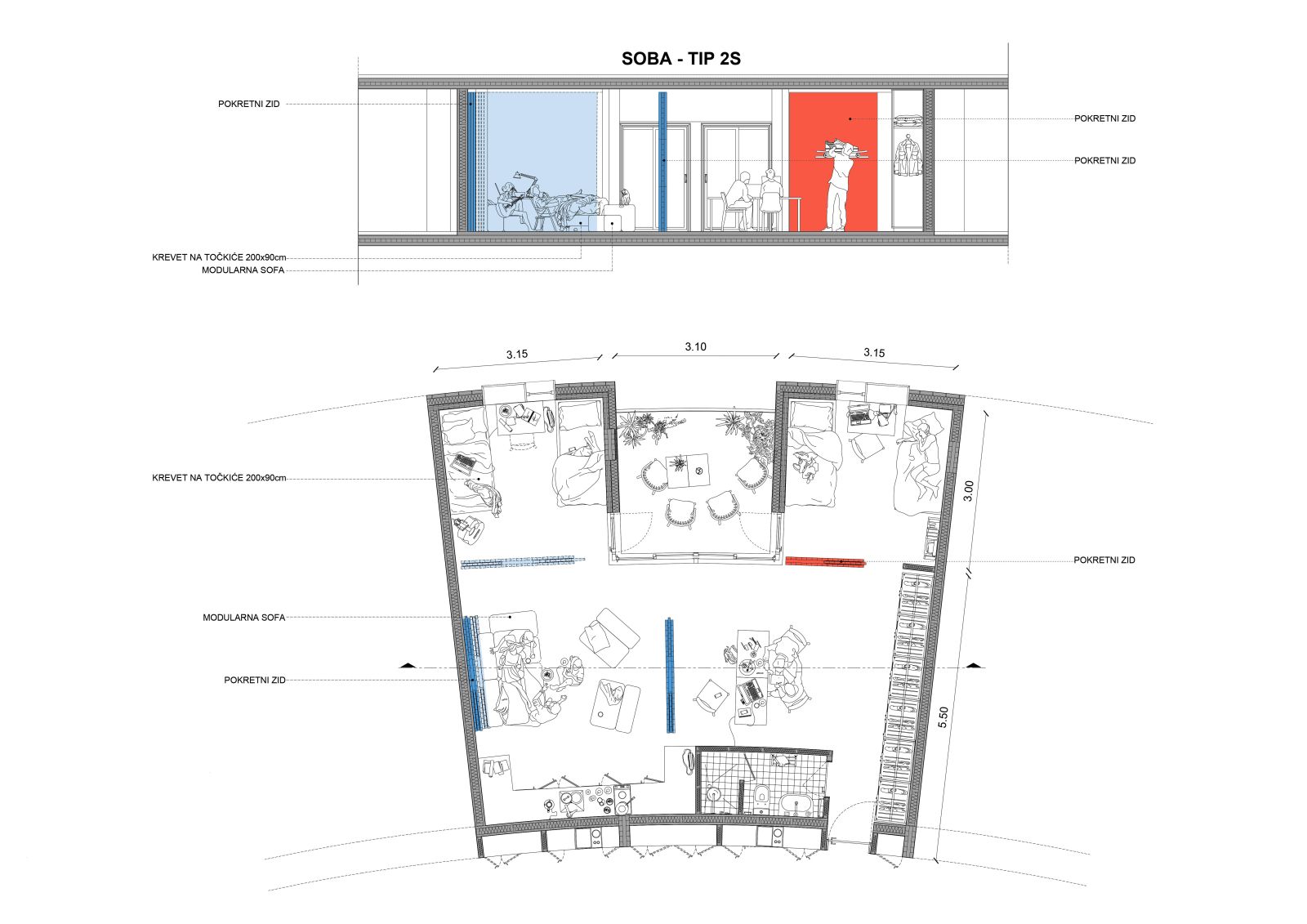Osnovnu dvokrevetnu sobu čini jedistven otvoren prostor, sa dva pomerljiva zidna elementa, koji mogu da se pozicioniraju na više načina u odnosu na bliskost među studentima.