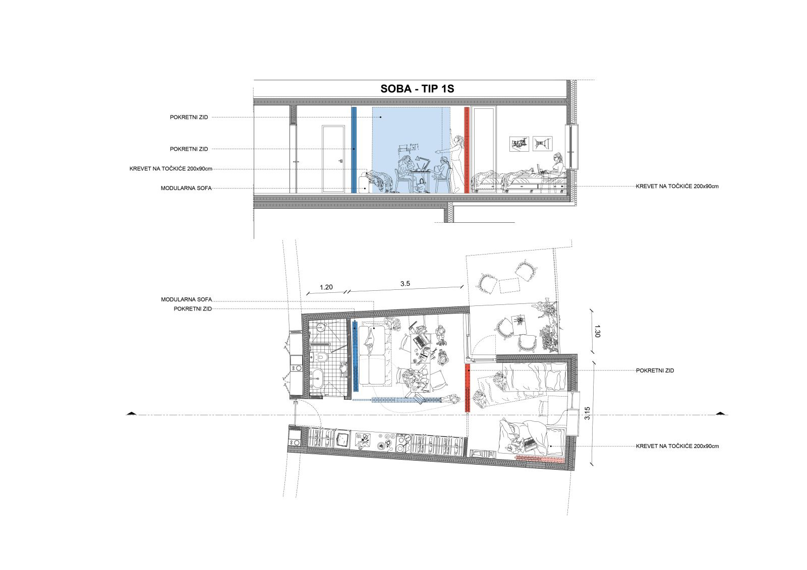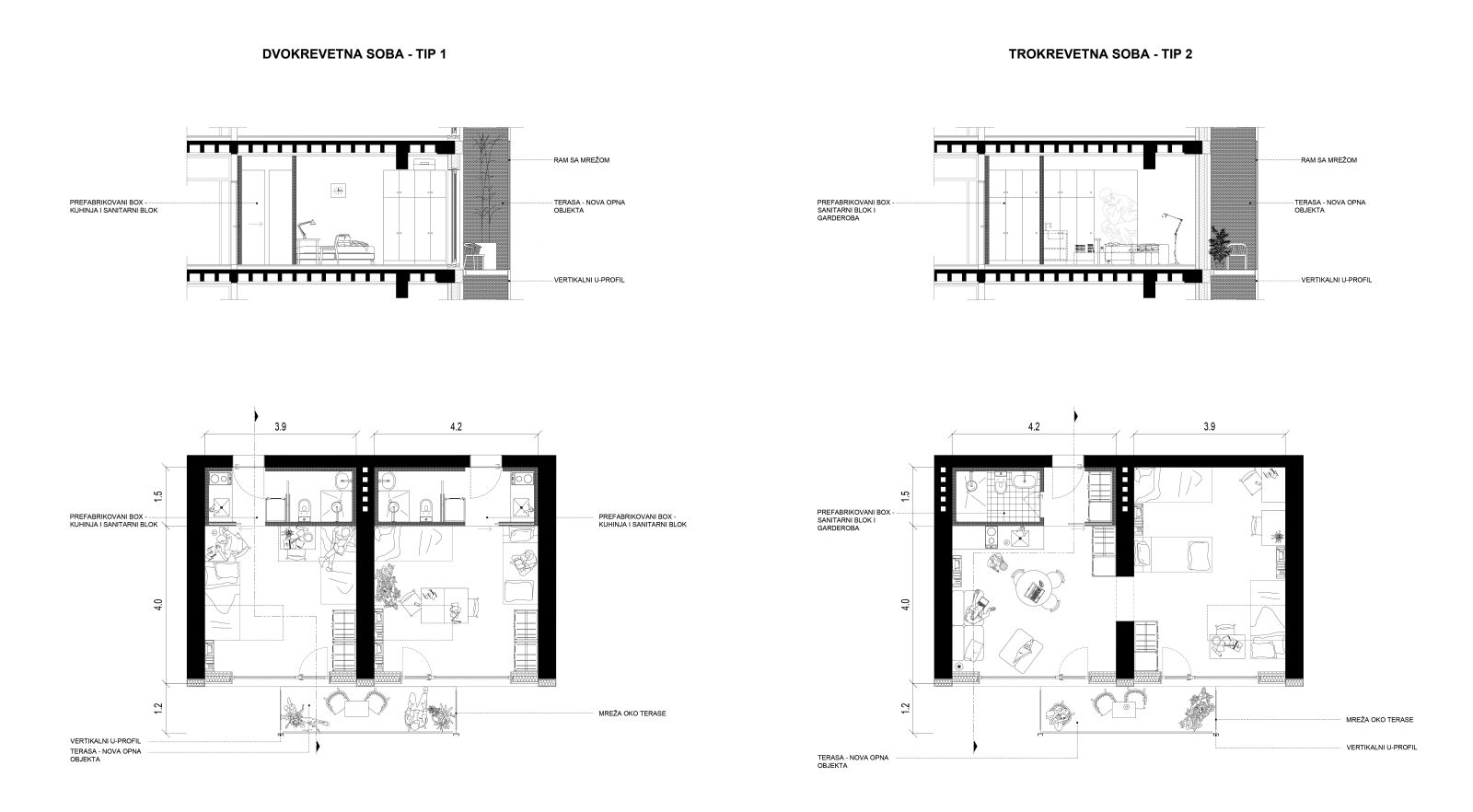 3. OBOGAĆIVANJE TIPOLOGIJE SOBA uvođenjem udvojenog tipa sobe, gde troje studenata dele zajednički dnevnu zonu, kuhinju i kupatilski blok. Dodatno na svakoj etaži je jedna soba otvorena ka zajedničkoj komunikaciji radi formiranja manjih dnevnih soba na višim etažama, kako su do sada svi zajednički prostori bili smešteni samo u prizemlju.