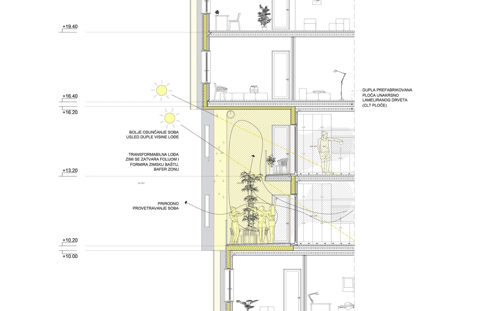 4. DODAVANJE DUPLE OPNE na postojeću zgradu omogućava se dodatni mikroklimatski regulator, kao i nove deljene terase za sve stambene jedinice. Svake dve sobe dele po jednu terasu, a njihovim smicanjem dobijaju se duple visine terasa i novi mikro komšiluci za parove susedne sobe. Dodatno u okviru duple opne terase se smiču tako da susedi vide jedni druge, čime se dodatno inicira interakcija među stanarima, deljenje i formiranje novih prijateljstava “preko plota”. Rater nove duple opne je smaknut na pola postojećeg prepoznatljivog rastera starih lamela, tako da on ostane vidan i dodatno naglašen superponiranjem slojeva koji čine novu opnu. Sa spoljne strane omogućeno je potpuno zatvaranje strukture laganim platnenim zastorima kao šatita od direktnog sunca, ili providnim plastičnim folijama ka severnim stranama I visokom zelenilu, čime se formira jedna svojevrsna zajednička mikroklima u zimskim mesecima, velika vertikalna zimska bašta koju dele svi studenti jedne polovine lamele!