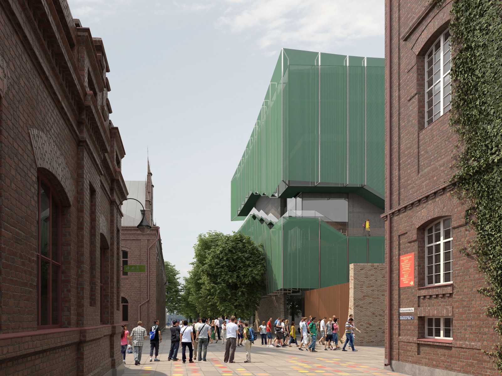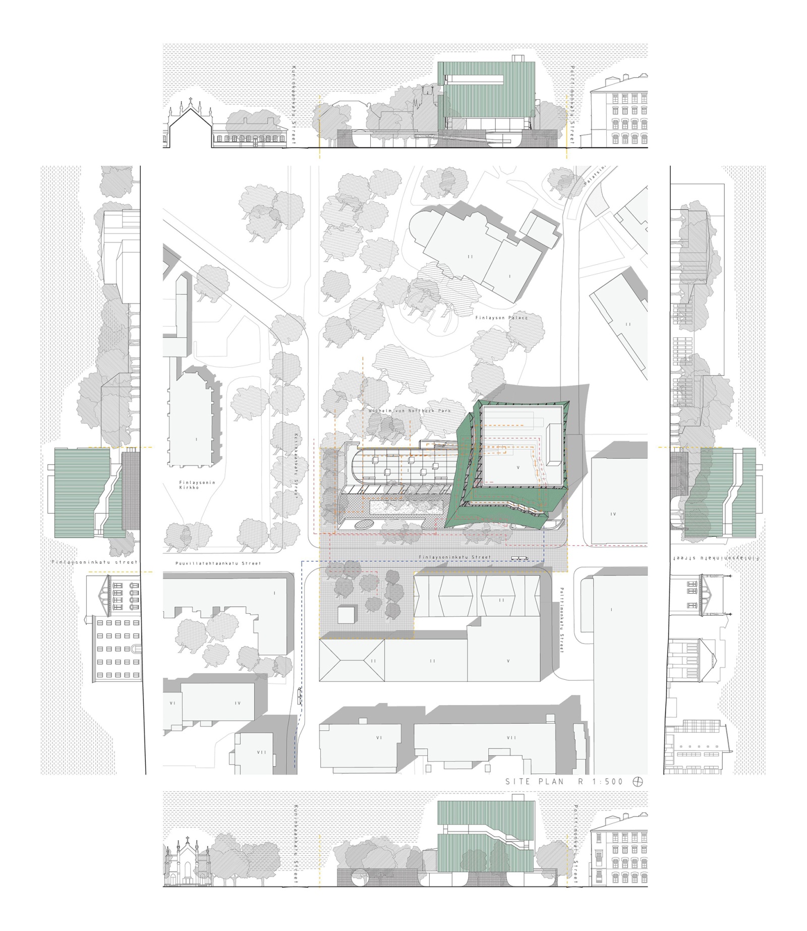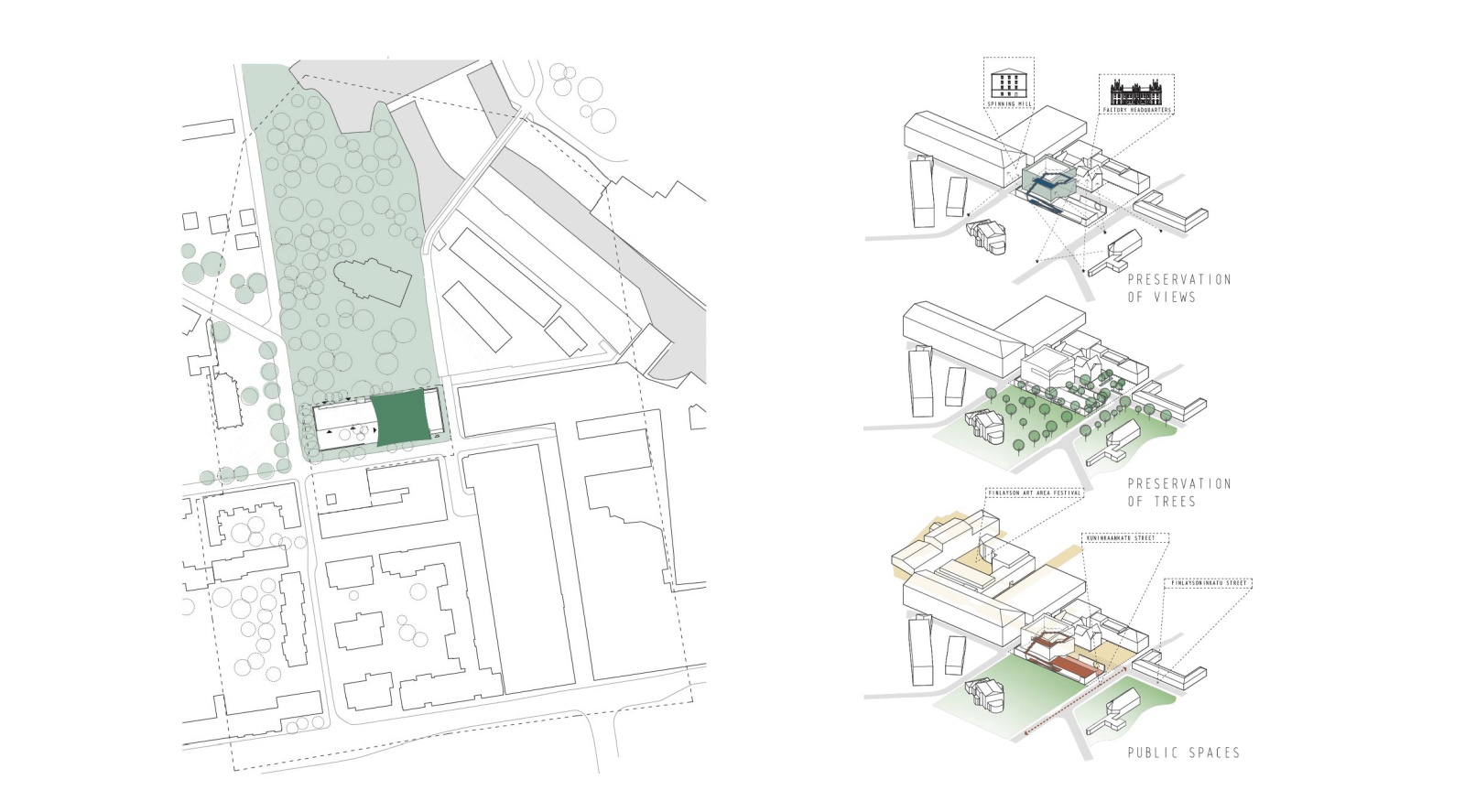 The museum is composed of two volumes that take up the side of the plot bordering the park, allowing for a small public gathering square by the factory headquarters buildings. One volume houses all main public facilities, it is elongated and low, sublty immersed in lush greenery, so that it preserves and protects all trees found on site. It opens directly towards Finlaysoninkatu Street, Kuninkaankatu Street and to the Wilhelm von Nottbeck Park, and houses an open exhibition terrace on its roof. The other volume holds the exhibition spaces, it is large and compact, elevated above the ground floor and carefully positioned so that it still allows views from all public spaces around, the park, streets and squares, so that while approaching the museum one has an immediate sense of its precious surroundings that are its integrated part. Images of the industrial buildings, the greenery and the new museum all constantly overlap and blur within each other. Exhibition spaces are large, simple and clear, with flexible partitions allowing for a number of different exhibiting options, while the visiting route is pushed to the outer perimeter to protect the exhibition inside, as well as to allow views from the inside towards the city.