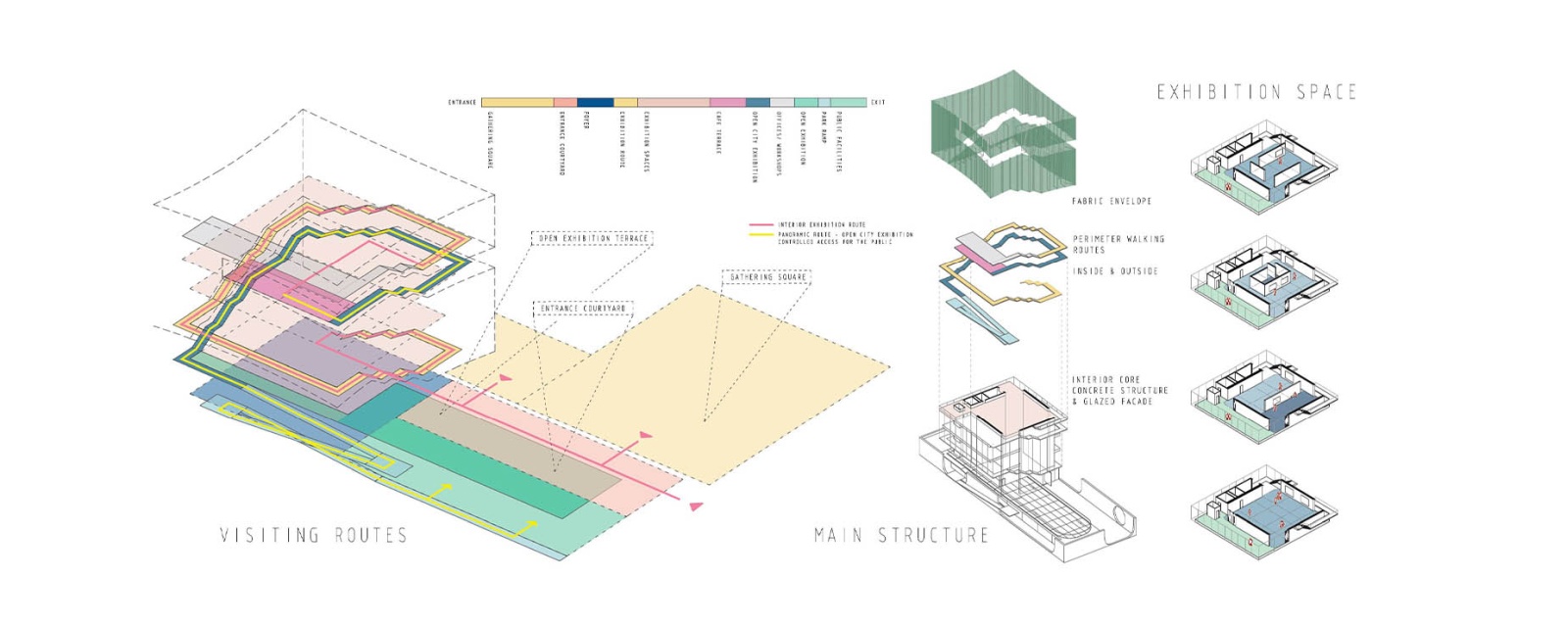 To allow views and at the same time to protect the exhibition, we created a multiply layered envelope by distancing the main concrete structure, glazed surfaces and outer layer of stretched fabric. The galleries are at the heart of the floor plan, protected by four structural concrete walls, while the main visiting route is pushed to the outer perimeter of the plan, between the concrete structure, glass and textile fabric. The envelope is sliced continuously on its outer perimeter to hold the exterior panoramic route.