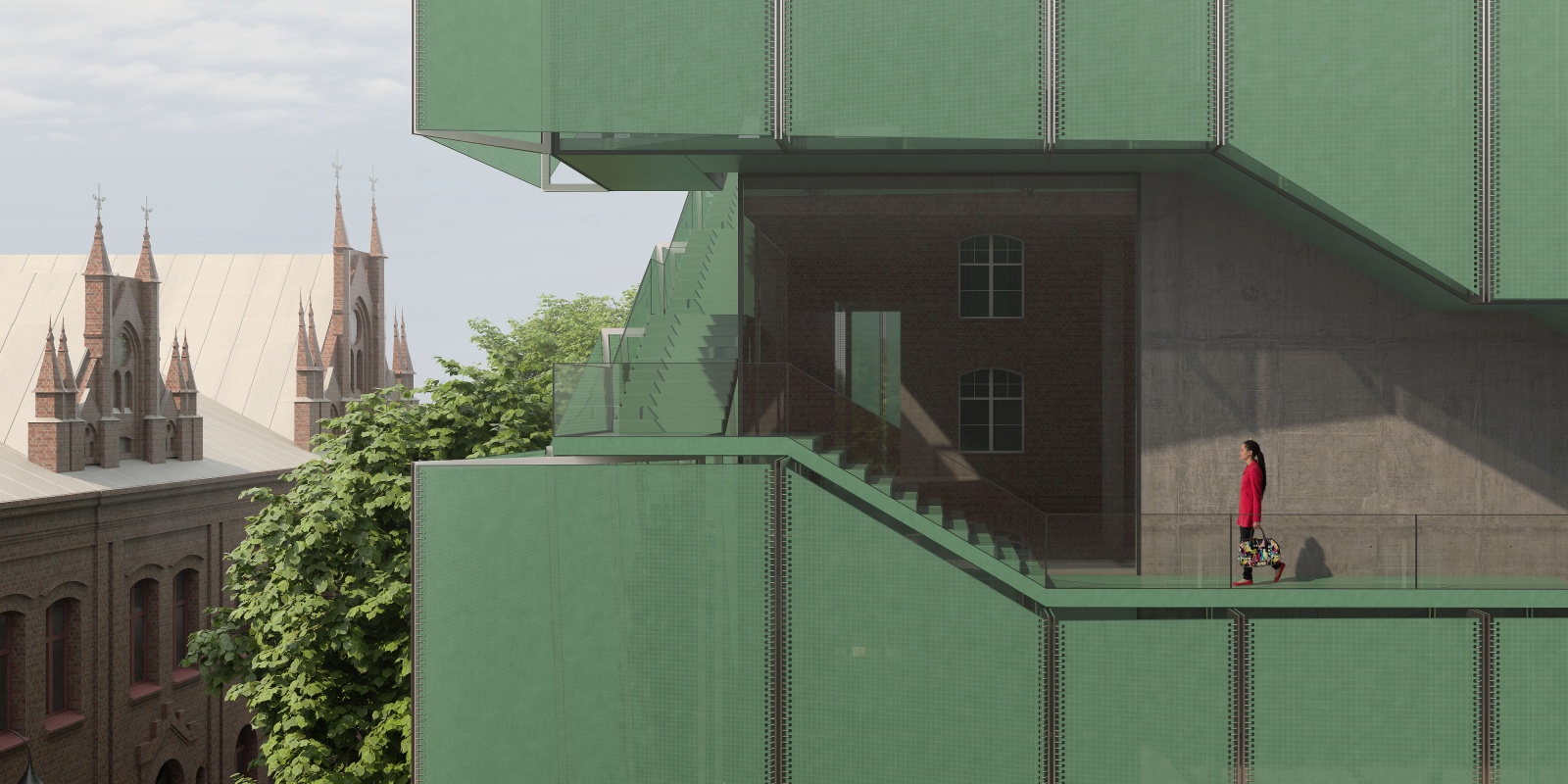 From this point the route continues on the outside with an open staircase gradually descending around the building, and showcasing the entire Finlayson area and its industrial heritage from above the tree crowns. This panoramic route offers the visitors new points of view towards the industrial buildings, the parks, the Tammerkoski rapids and beyond, and integrates fully the museum experience with the city of Tampere. The outdoor route ends with an open exhibition on the ground floor roof terrace at the height of the tree crowns. From here, a long ramp at the border of the park leads the visitors towards the point of entrance to the museum public facilities – the café, shop, multifunctional space and workshop that all open towards the entrance courtyard, this way completing the visiting route. The outdoor panoramic route is in this way open to the public when the museum decides so, so that one can climb the building from the park towards the open exhibition on the lower roof, and to the café terrace on top floor, for example during open museum days. This way, the museum can offer the city of Tampere a rich gradient of different public and semi-public spaces - from the park, pedestrian streets and squares to the open exhibition roof terrace, and if decided as such, even to the viewpoint terrace on top.