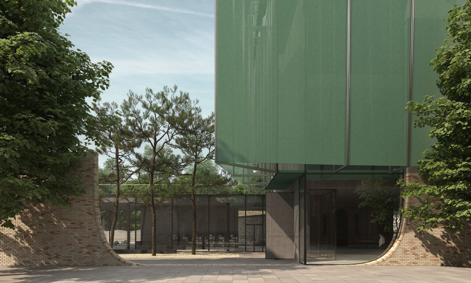 The main exhibition volume is lifted and light, enveloped in diaphanous fabric that permits filtered views both from the city inside, as well as from the interior space towards the city. The fabric acts as a buffer layer protecting the fragile works of art by dispersing direct sunlight into a sage green luminous fog inside. On the outside it appears light and airy, blurring the views during the day, and glowing at night. The idea of a textile façade stems from the Finlayson area and the city of Tampere cotton factory origins, as well as Sara Hilden’s personal vocation in fashion industry. Light textile volume of the museum is sensitively integrated within the cityscape to form a new city landmark, rising above the historical buildings and the trees of Wilhelm von Nottbeck Park. With its lightness it doesn’t impose on the red-brick industrial buidlings around, but builds on the strong identity of the Finlayson area, adding it a new contemporary note. In contrast, the ground floor volume is bordered by a beige brick wall, carefully constructed to form a dialogue with the surrounding buildings and to frame views towards them. The crafted details of rounded lines correspond to the meticulous rich details of red brick Neo-Gothic facades of the factory headquarters neighboring the site.