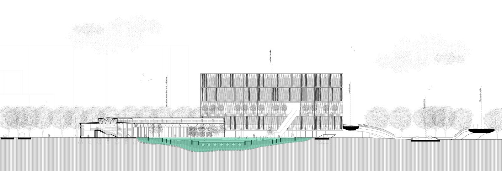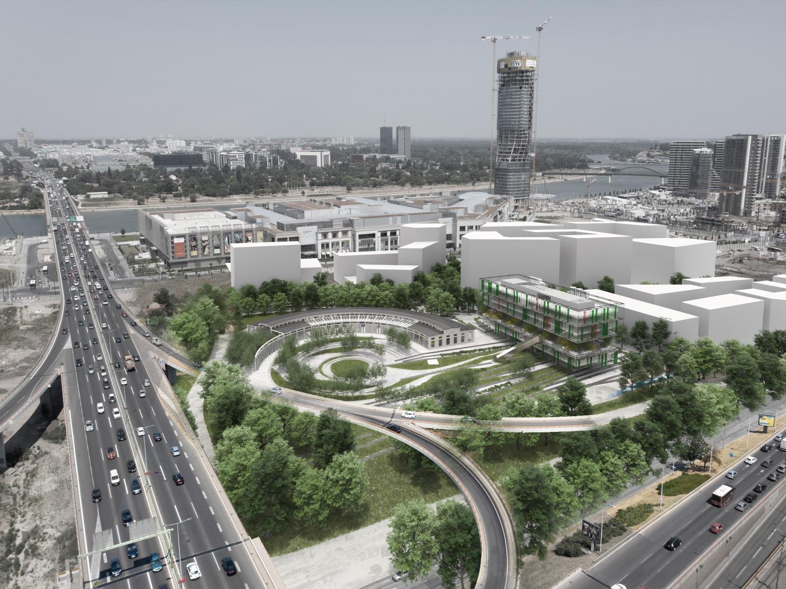 Kao jedna od najprometnijih saobraćajnih petlji, Mostarska petlja je među najkritičnijim tačkama po zagađenju vazduha u Beogradu (prema podacima prikupljanih iz automatske merne stanice koja se nalazi u blizini predmetne lokacije, izvor Zbornik radova 12. Regionalne konferencije „Životna sredina ka Evropi‟ beograd, Srbija 2016). Sa premeštanjem železničke stanice i dodatnim saobraćajnim opterećenjem ove zone, situacija teži da se pogorša u bliskoj budućnosti. Poslovni aneks, u duhu ideje o tehnološkom progresu, dobija kiseoničnu - O2 - opnu koja po sistemu foto-bioreaktora na bazi mikroalgi prečišćava vazduh u neposrednom okruženju, pre svega čineći sredinu za rad ljudi zdravijom, i istovremeno dajući celom kreativno-inovativnom centru novi specifičan identitet kao simbol borbe za zdrav život i okruženje u budućnosti.
