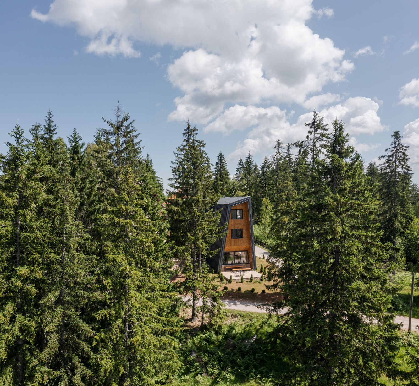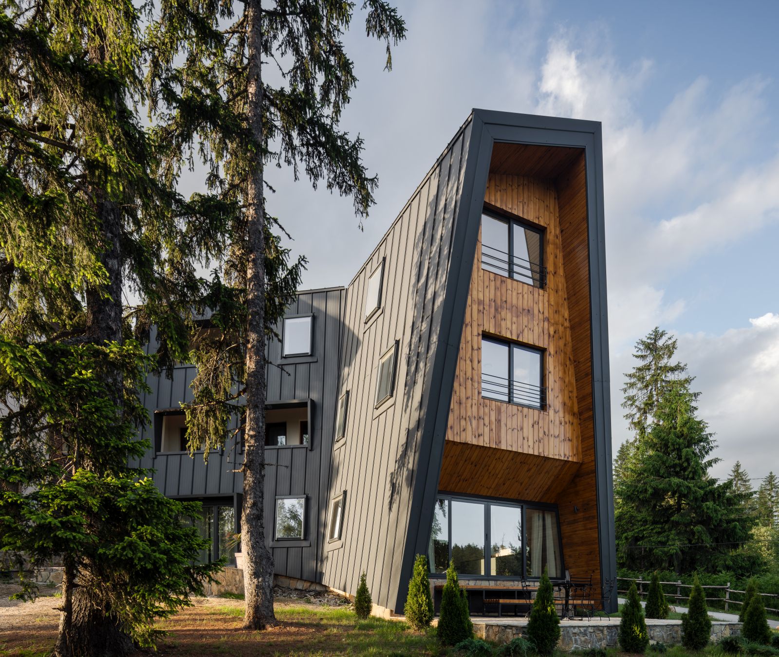 Vila Plava arises from the need to emphasize the unique mountain environment with architecture - air currents, the smell of dense spruce trees, and views of the vast expanse of nature. Every space opens to the mountain on two or more sides, which enables a free, but also, if necessary, an orchestrated flow of mountain air through the entire house. The interior spaces are tucked away with a roof that descends to the very ground, so they can comfortably wait out even the harshest mountain winters.
