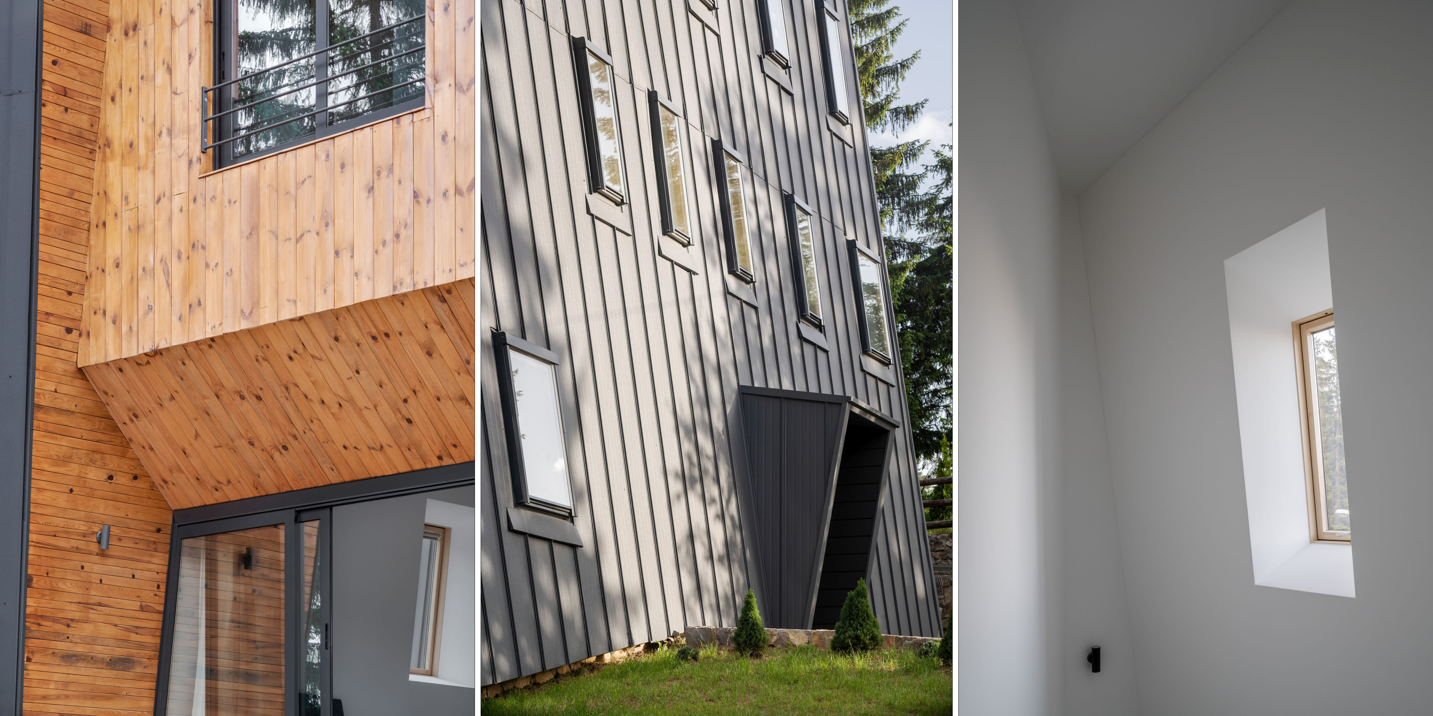 All applied materials are local, natural and simple.The cascading pedestal of the house, supporting walls and paths are paved with local stone, the work of famous Zlatar’s stone masons – “Zlatarski kamenjari”. The roof structure, which also forms a large part of the house's envelope, hides supporting angled concrete columns and solid wood structure, and is covered with anthracite gray corrugated metal sheets, while the facade under the large roof is in naturally treted wood. Roof windows are wooden, locally made, and all floors in the interior are in polyurethane.