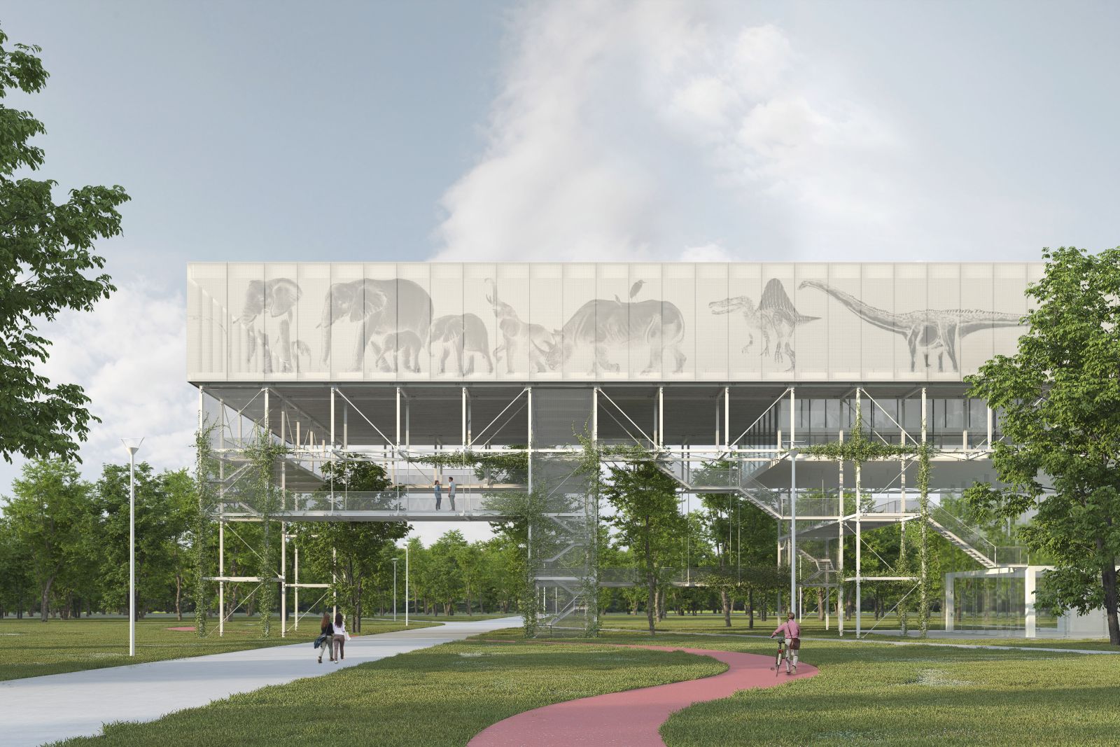 Zgradu muzeja čine dva jasno razdvojena volumena – jedan na tlu, i jedan u vazduhu. Među njima je vazdušasta čelična rešetka koja nosi jedan volumen i oslanja se delom na drugi. Ispod se provlači otvoreni prostor parka, i nalaze se potpuno transparentne zone muzeja - za publiku i zaposlene, ispod i u okviru čelične strukture. U skladu sa tim, zgradu muzeja programski čine četiri jasno prepoznatljive celine, a prema četiri karakteristične, podjednako važne, linije delatnosti muzeja – čuvanje zbirki, naučno proučavanje i konzervacija, obrazovni rad i izlaganje prirodnjačke baštine. Volumen na tlu je primarno tehnološkog karaktera (zatvorena zona). Biološki i geološki depo su na dva nivoa pod zemljom, gde samo tlo oko depoa formira dodatnu zaštitu od spoljnog sveta sa svih strana. Odmah iznad njih u nivou prizemlja su prostorije za rad sa muzejskim materijalom. Kancelarije kustosa su na nivou rešetkaste strukture, sa pogledom na park sa svih strana. Izložbeni prostor je u dva smaknuta volumena na vrhu, gde najdominantiji volumen stalne postavke monumentalno lebdi nad nepreglednim parkom. Zona za publiku, i zona edukacije je u prozračnom prostoru u srcu kuće muzeja, pristupačna iz parka sa svih strana. Svi nivoi povezani su teretnim i putničkim liftovima razdvojenim prema nameni, tako da su jasno odvojene čiste i prljave putanje.