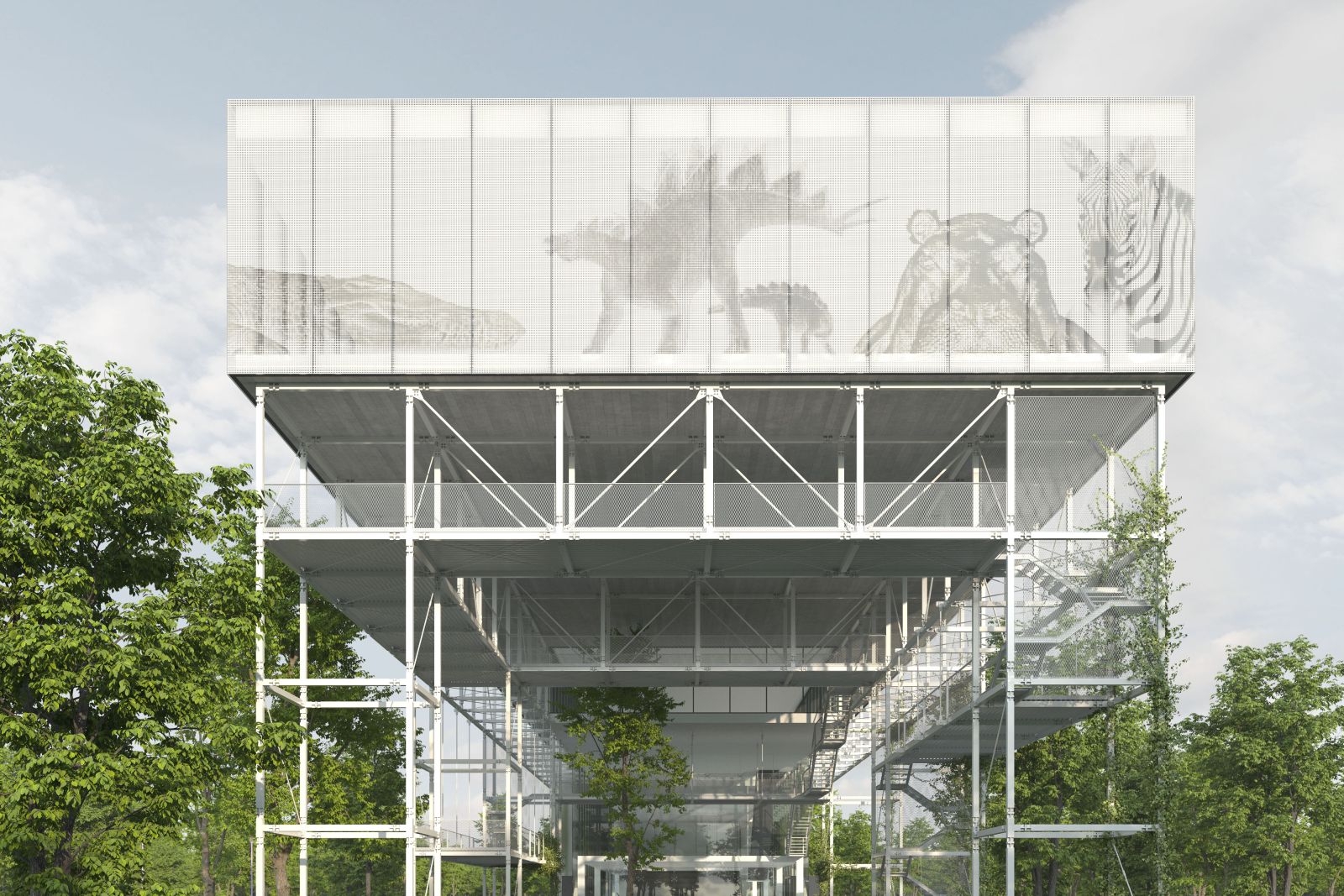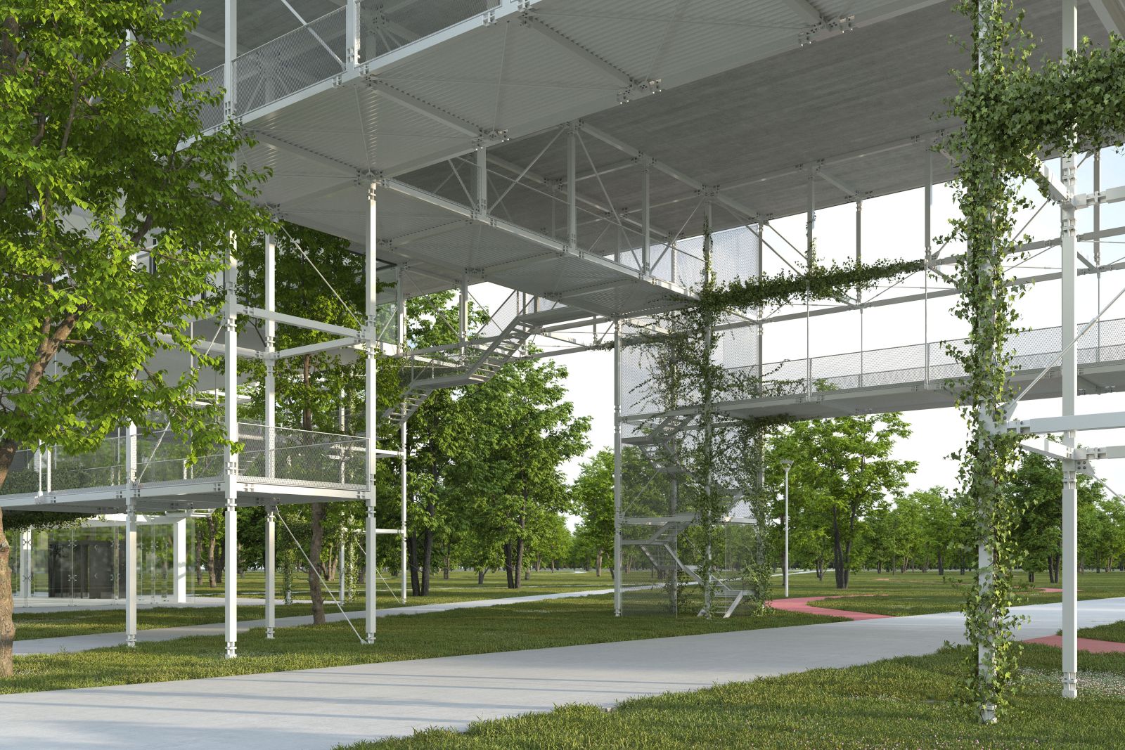 Istovremeno u ovom prostoru se razvija niz mikrosituacija za susrete i neformalna okupljanja na otvorenom, sa ciljem da novi otvoreni prostori muzeja svojom energijom pokreću društvo i jasno komuniciraju uzbudljivost znanja o prirodi, kao i beskompromisni značaj njene zaštite. Čelična struktura je iz blizine poput otkrivenog skeleta kuće, potpuno izložena prolaznicima parka, dok je iz daleka je neprimetna - kuća muzeja potpuno levitira nad parkom. Ona je mesto sjedinjavanja kuće muzeja sa prirodom - ovaj prostor će vremenom priroda potpuno obuzeti ekstenzivnim ozelenjavanjem strukture i visokim drvećem koje će porasti ispod i oko nje. Svaki put pri obilasku muzeja utisak posetioca će se menjati, kako zbopg sezonskih promena prirode, tako i iz godine u godinu, kako čelik sve više bude nestajao, a priroda oko njega bujala!