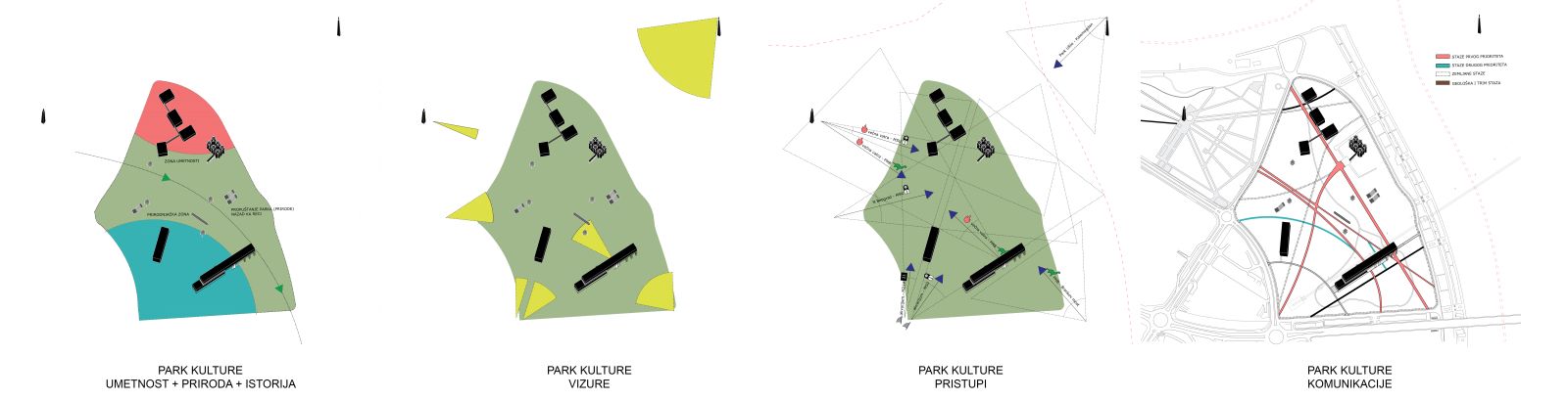 Područje Parka prijateljstva zonirano je tako da se komplementarne celine i sadržaji prelivaju jedni u druge, i čine jednu koherentnu celinu, vodeći posetioce postepeno kroz prirodu ka kulturi, od mirne sportsko rekreativne zone na severu, do svojevrsnog novoformiranog Parka kulture u bloku 15 na jugoistoku. Park kulture ćini kompleks novih muzeja, kao i malih izložbeno-edukativnih sadržaja, paviljona i scena na otvorenom, u prirodnom prostranstvu. Svi novi objekti kulture su pozicionirani tako da ostavljaju veliko zeleno prostranstvo u sredini lokacije čisto, a na krajevima formiraju manje tematske celine posvećene specifičnim temama, u odnosu na sadržaje u okruženju uz koje se nalaze. Kroz ceo kompleks prolazi nova pešačka Ulica kulture koja povezuje sve muzeje i vodi od priobalja i Velikog i Malog ratnog ostrva, ka Starom Sajmištu. Pozicioniran na samom jugoistoku lokacije, i usmeren ka reci Savi i ka Kalemegdanu, objekat Prirodnjačkog muzeja levitira nad parkovskim prostranstvom.